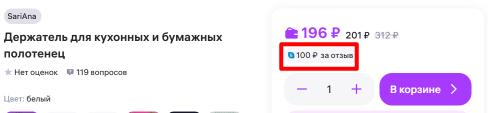 - Найти товар, у которого явно указано вознаграждение «за отзыв» (размер и условия).