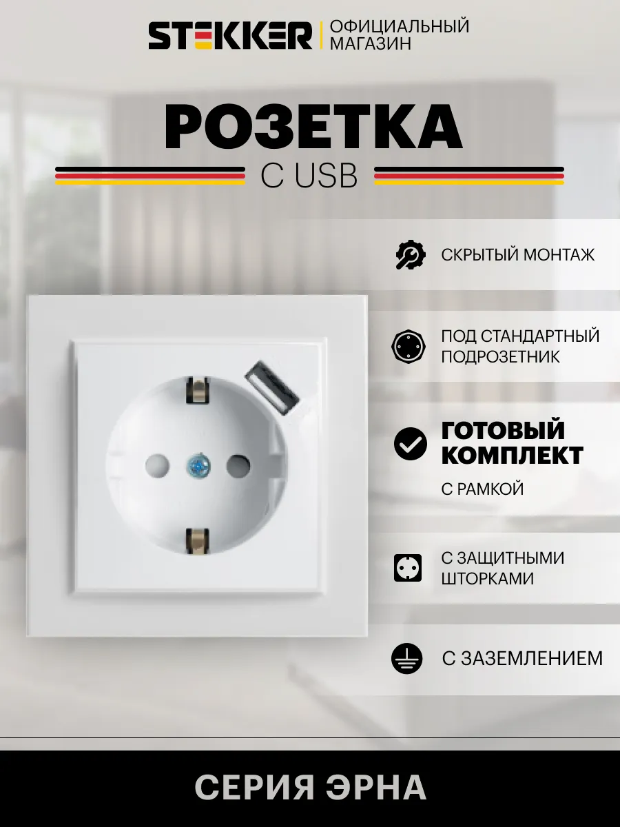 Розетка одноместная с usb белая с заземлением. Feron, официальный магазин