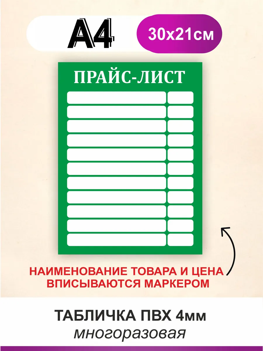 Табличка прайс с окошками. Вписывается маркером. Размер А4. БезтраблТабл