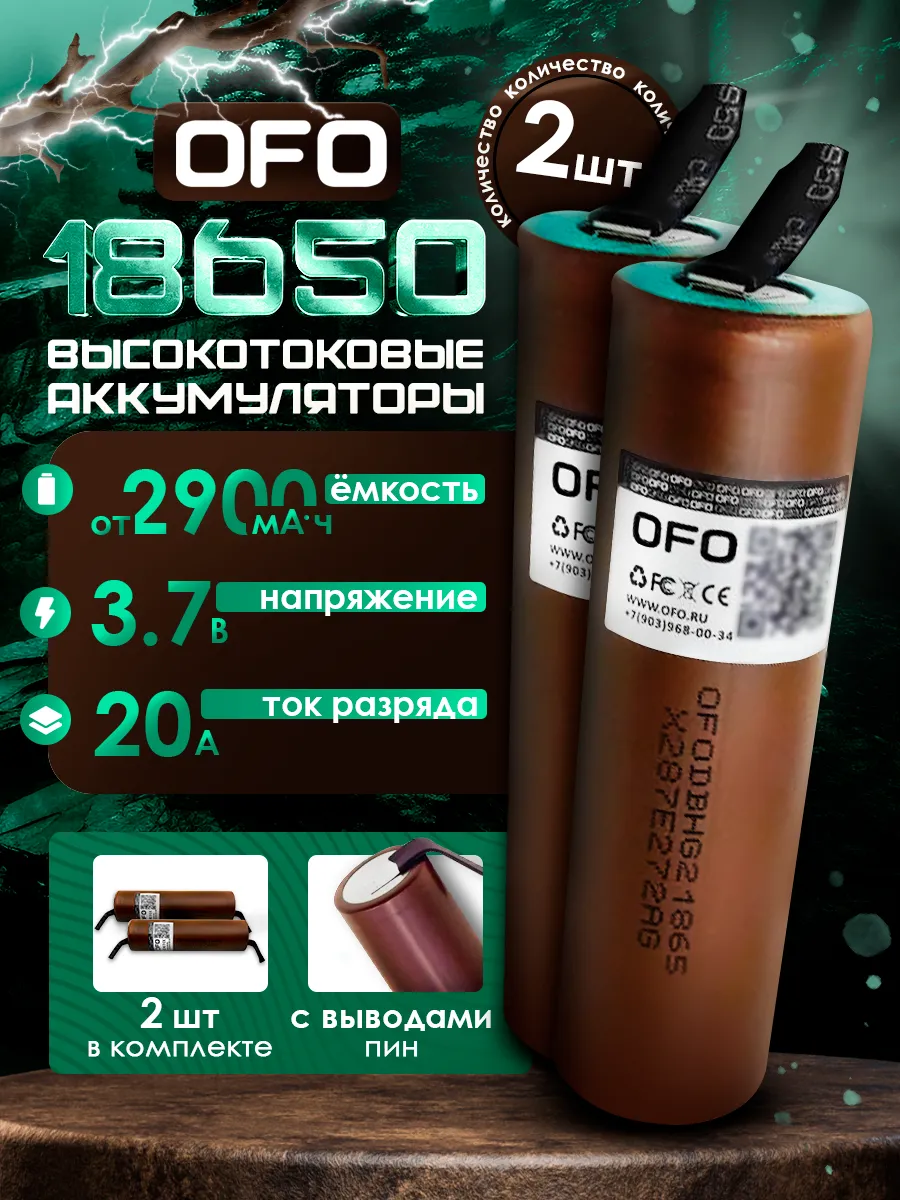 Аккумулятор 18650 HG2 Li-ion 3.7В, до 20А, с выводами 2шт. OFO Официальный магазин