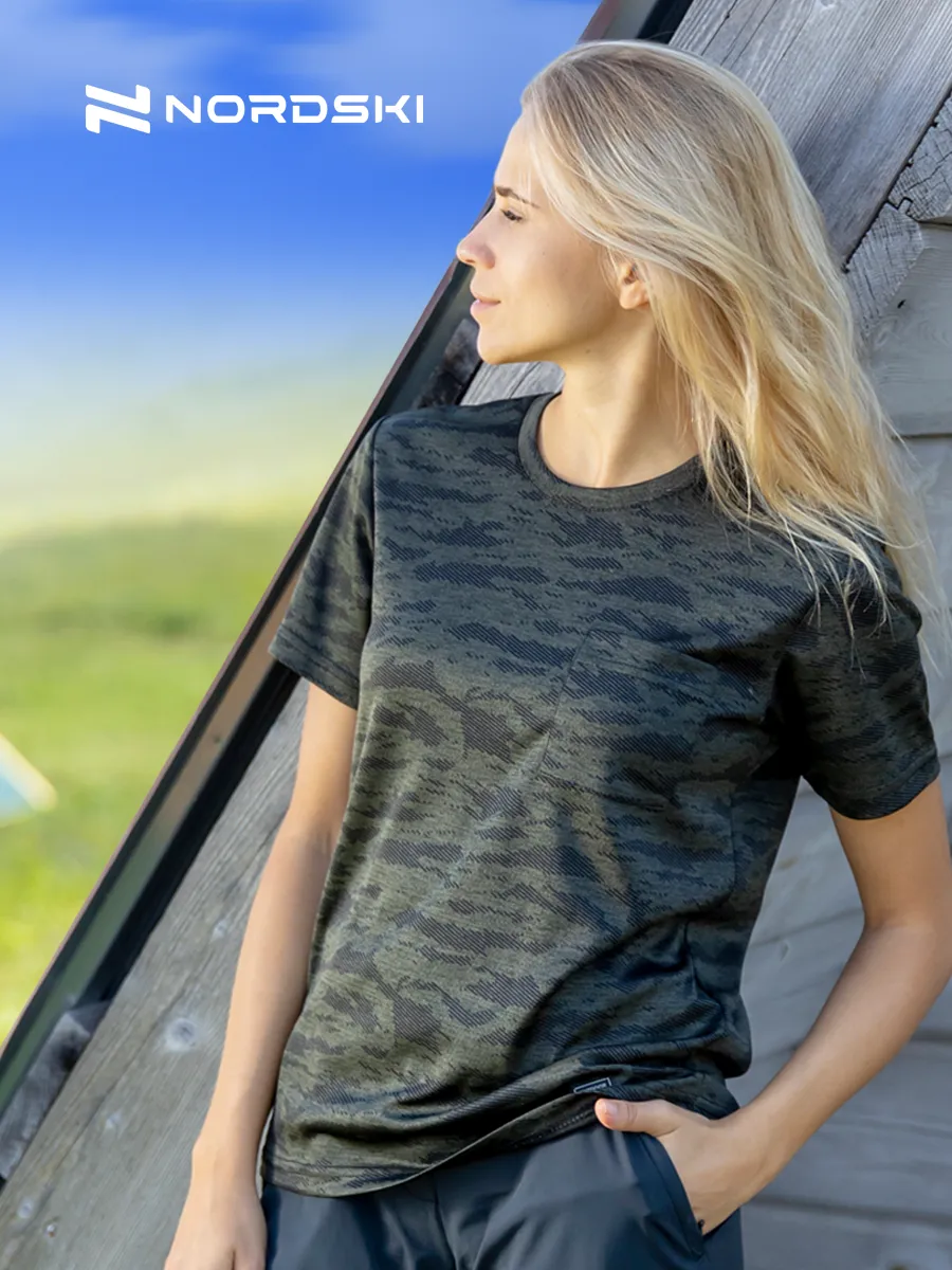 Для активных женщин и любителей спорта. Футболка спортивная стрейч милитари Military NORDSKI подойдет для занятий спортом, тренировок или просто для повседневной носки. Стратифицированная ткань обеспечивает свободу движения и комфорт. Возможность носить ее как с длинными, так и с короткими штанами.