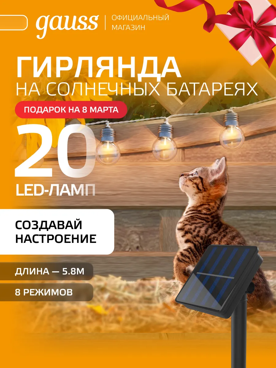 Гирлянда садовая на солнечной батарее 20 LED ламп. GAUSS — ОФИЦИАЛЬНЫЙ МАГАЗИН