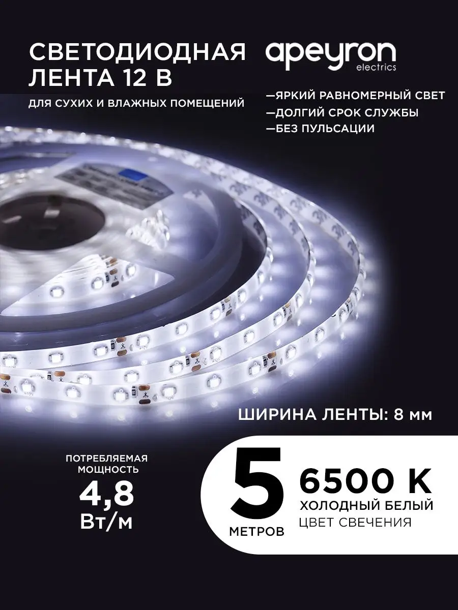Светодиодная лента 12В, СТ 4,8Вт м 5м IP65, 6500К. Apeyron