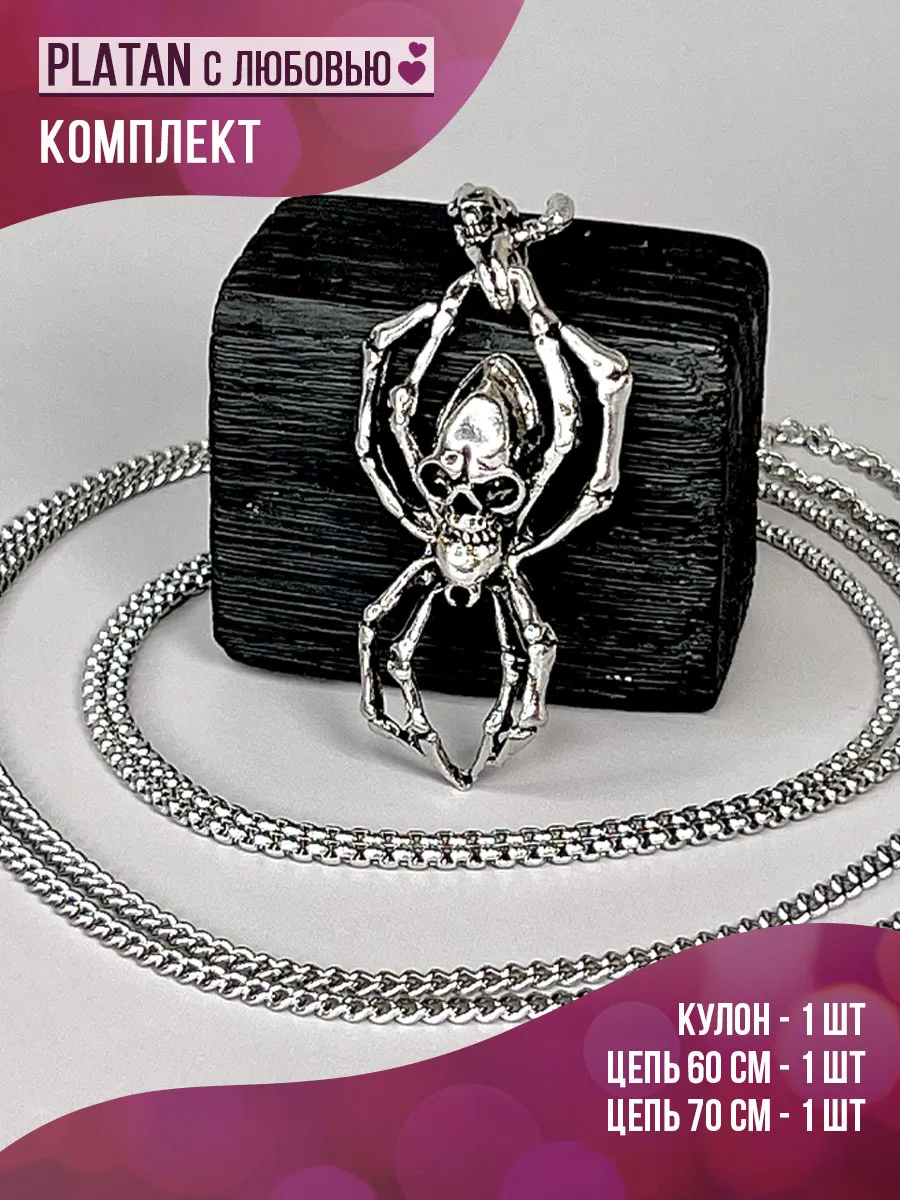 Длинная готическая цепочка на шею с подвеской паук с черепом. PLATAN С любовью