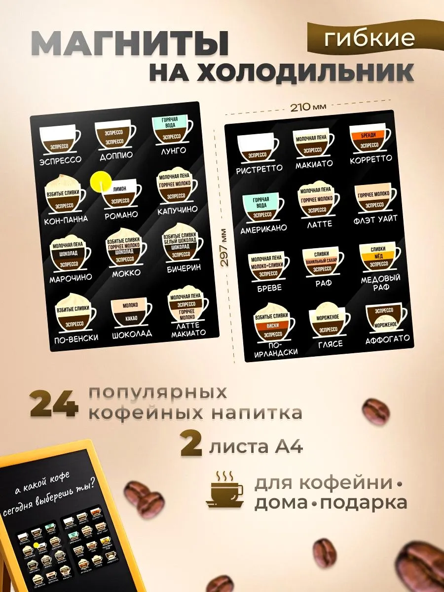 Сделайте свой холодильник еще более уютным с магнитами, представляющими виды кофе и включая рецепты черного кофе. Ideal для любителей кофе, которые хотят поделиться своими предпочтениями с семьей и друзьями. Прекрасный способ украсить кухню и добавить немного личности в свой дом.