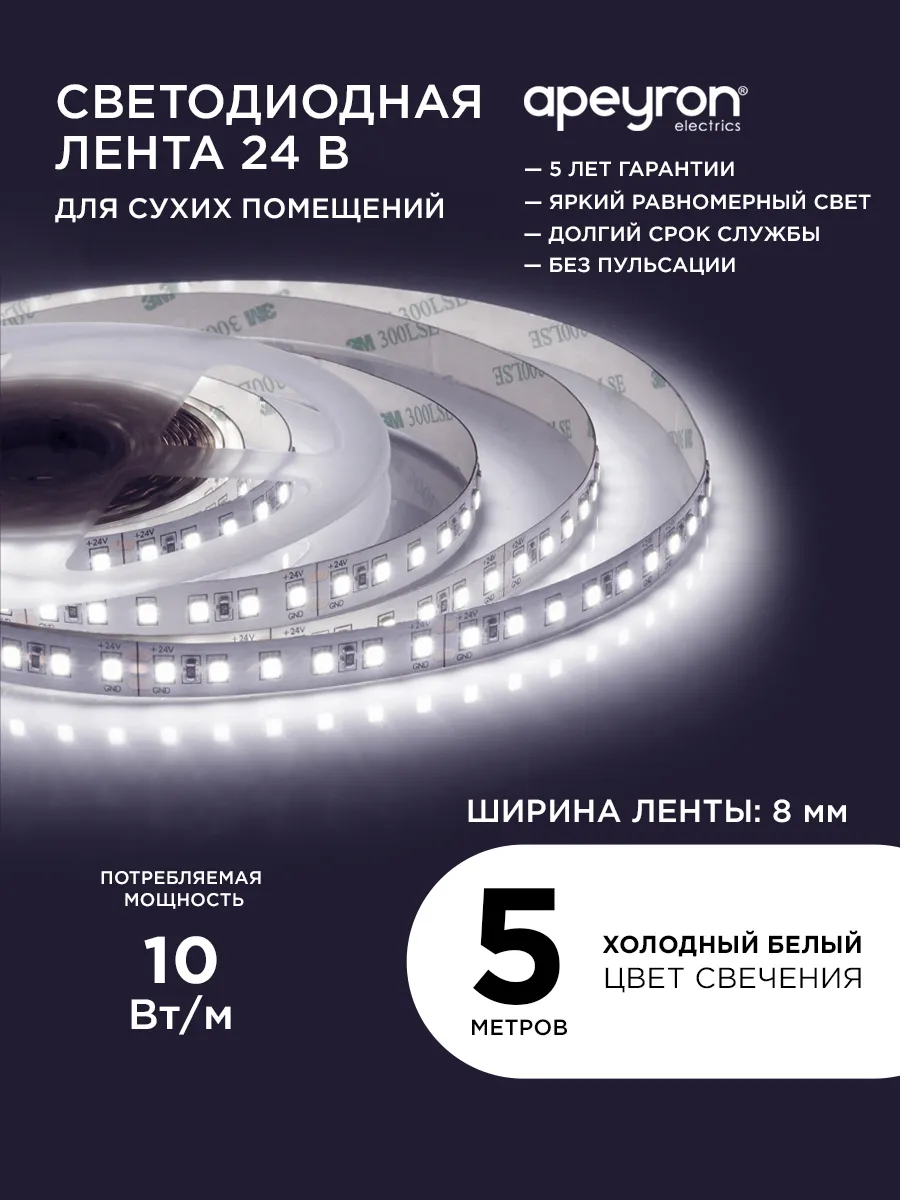 • Светодиодная лента 24В, 10Вт м, 4000К, 5м. Apeyron
