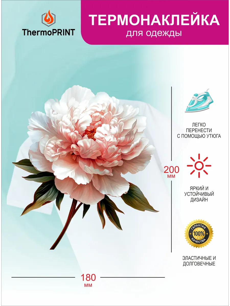 Термонаклейка на одежду Белый Пион Цветы. ПРИНТ