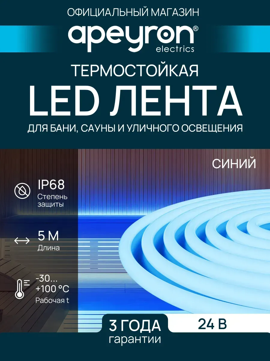 Светодиодная лента для бани и сауны термостойкая, 5м. Синий. Apeyron Electrics