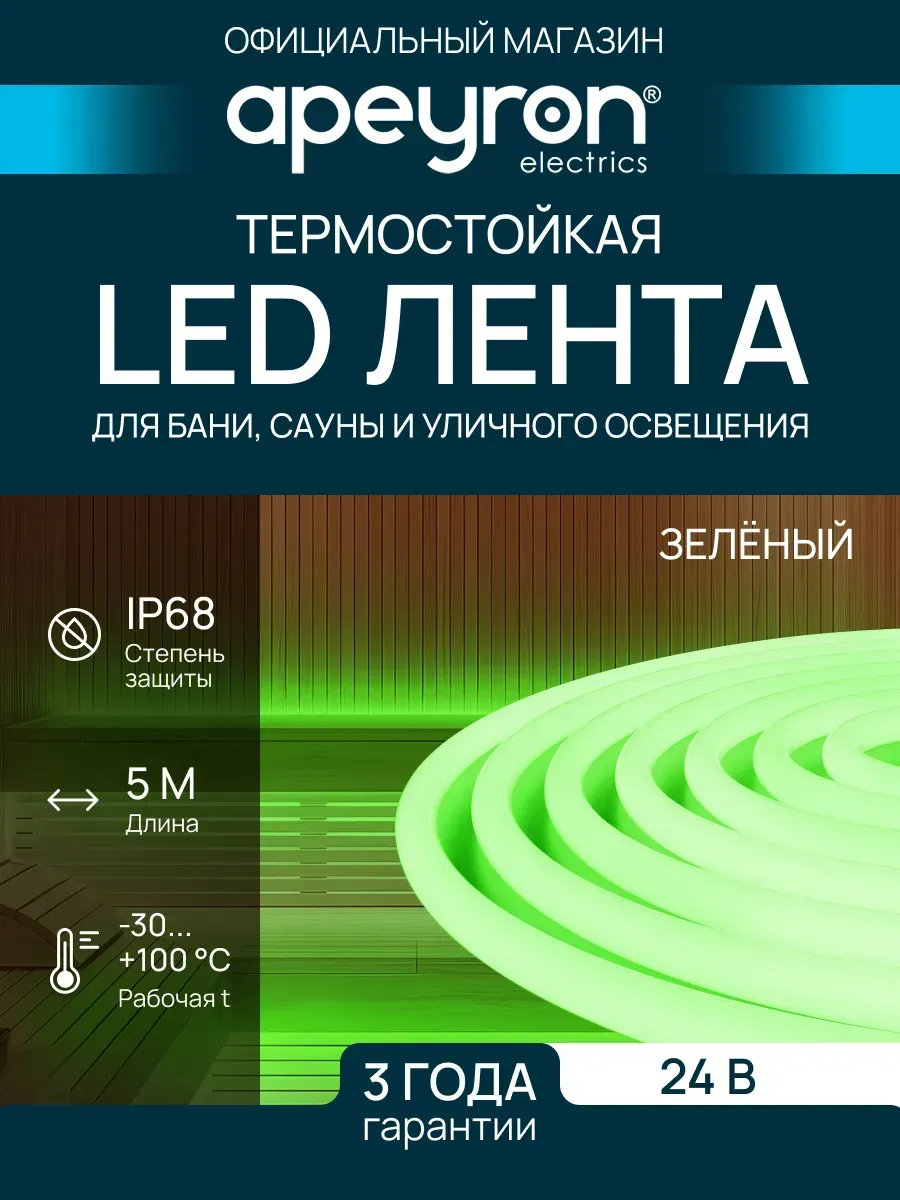 Светодиодная лента для бани и сауны термостойкая,5м. Зеленый. Apeyron Electrics