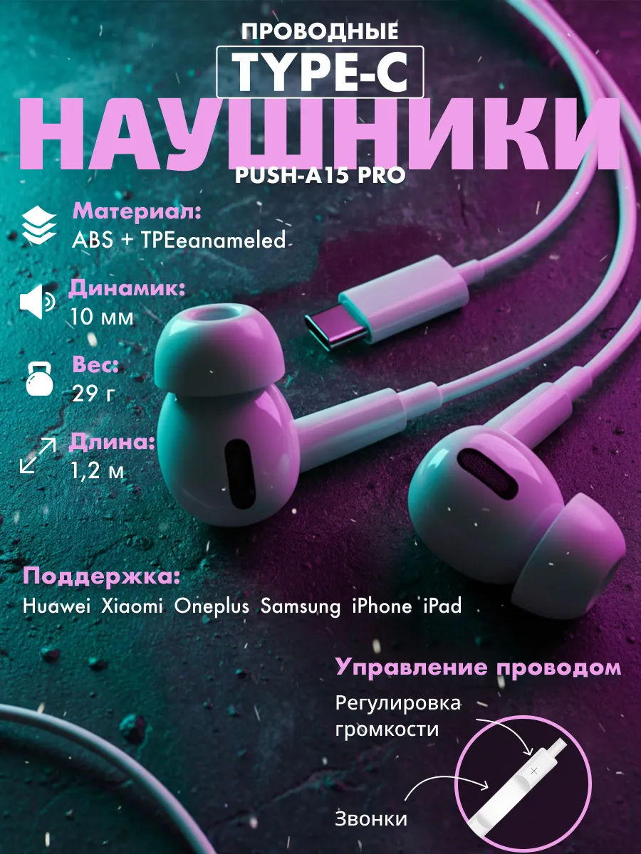 Наушники проводные для телефона iPhone и Android Type-C. Pushbox
