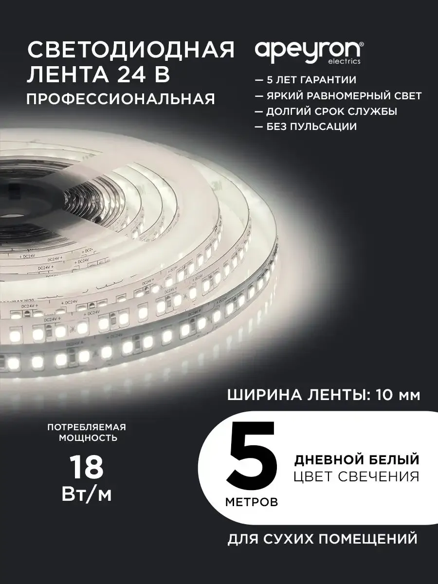Светодиодная лента 24В ПРО, 18Вт м, 5м, д б, 4000К. Apeyron Electrics