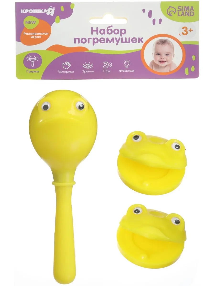 Набор погремушек Лягушата включает в себя кастаньеты и перкуссионный маракас,ideal для развлечения и развития слуха детей. Преимущества: развивает слух и координацию, стимулирует кreativность, удобна в транспортировке и использовании. Подходящая для детей от 6 месяцев и старше.