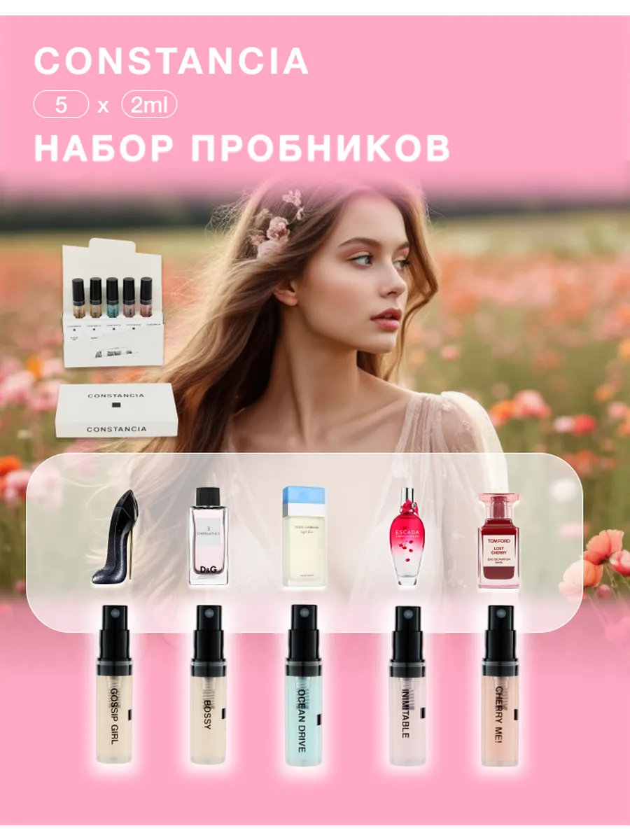 Набор пробников женских духов от известного бренда — отличное решение для тех, кто хочет найти свой идеальный парфюм. В наборе 5 разных ароматов, которые можно попробовать и выбрать наиболее подходящий для вас. Это идеальный подарок для себя или друга, а также отличная возможность попробовать новые запахи без покупки полного бутыли.