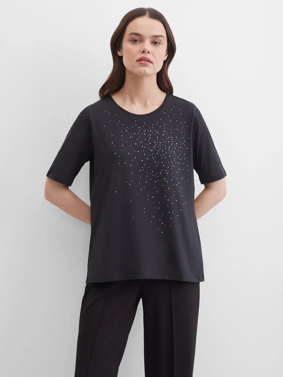 Футболка свободной формы с украшением стразами станет идеальным дополнением к вашему гардеробу. Крепкий и мягкий материал обеспечит вам комфортное ношение. Украшение стразами добавит вам особой выразительности. Подойдет для повседневной носки или как незаконченный элемент гардероба.