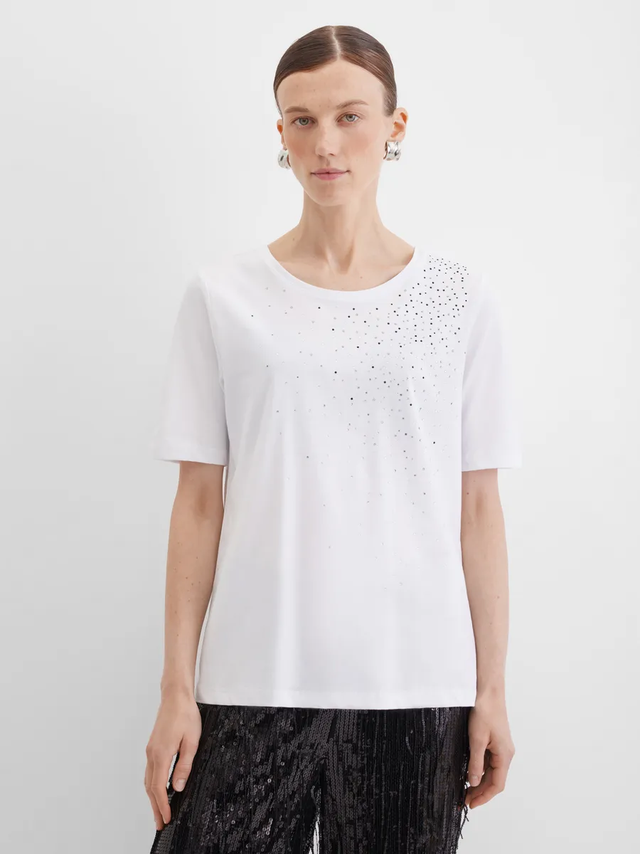 Свободная футболка со стразами от Герри Вебер станет идеальным дополнением к вашему гардеробу. Элегантный дизайн и комфортная фактура делают ее отличным выбором для повседневной носки. Футболка идеально подходит для женщин, которые ценят удобство и стиль.