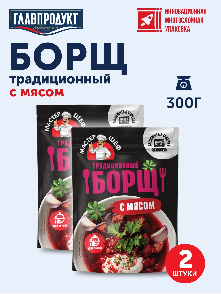 Предлагаем вам удобный и вкусный вариант быстрого приготовления борща с мясом в реторт-пакетах. Пара порций борща с мясом Мастер шеф, каждая из которых весит 300г, позволит вам легко накормить свою семью. В каждом порции содержится сочное мясо, свежие овощи и ароматные специи, которые сделают ваш обед вкусным и сытным. Подойдет для семейного ужина или для подарка друзьям и близким.