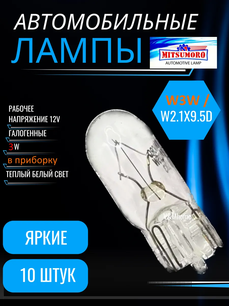 Лампы галогенные авто в кнопку w3w w2.1×9.5d 12V 10шт. V&MHome