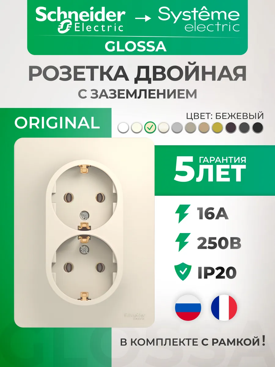 Главная / Розетки и выключатели / Розетка двойная бежевая с заземлением Glossa. Elecmax