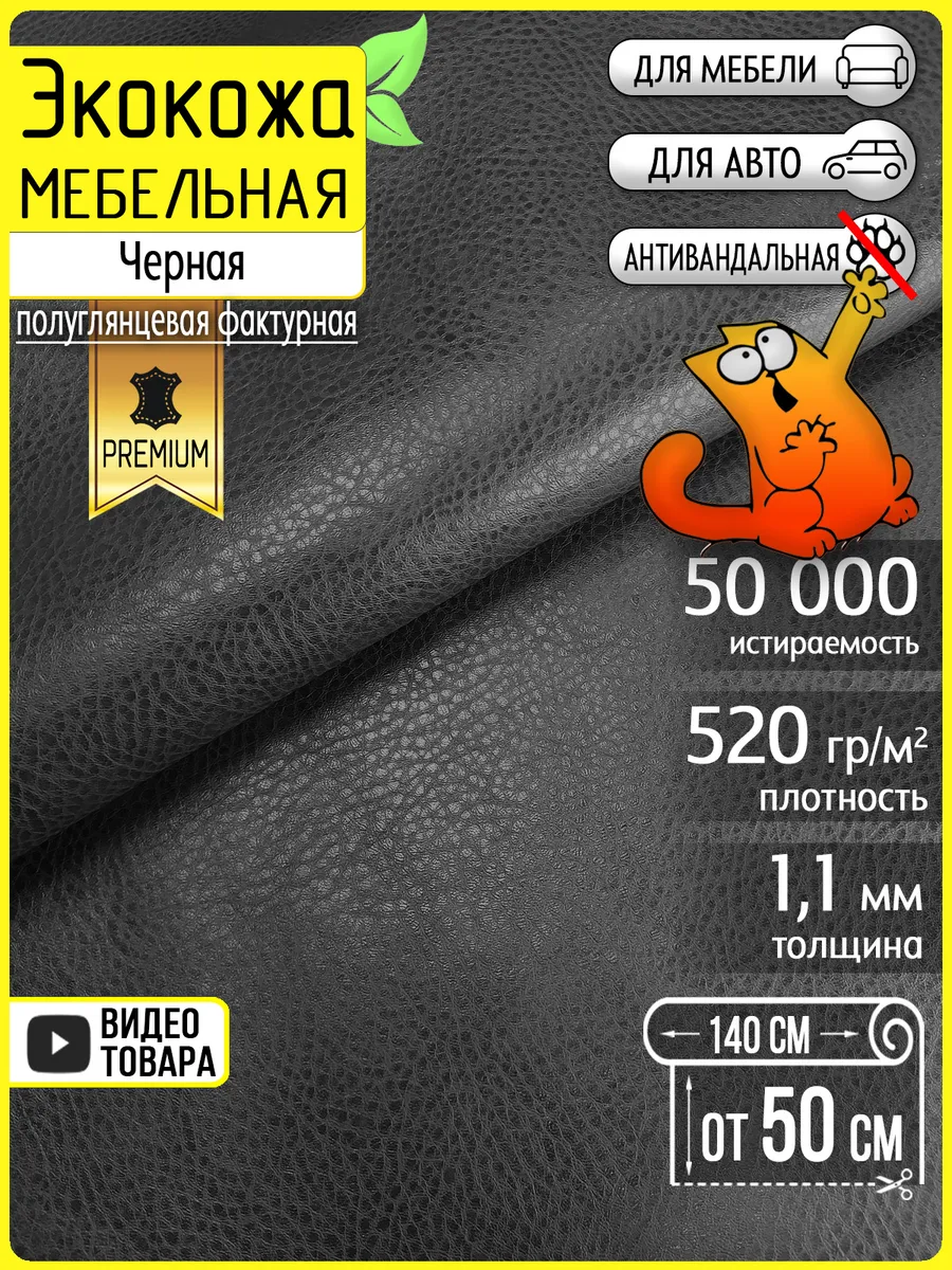 Экокожа для мебели черная Tempo Black, 50х140см. БинБег