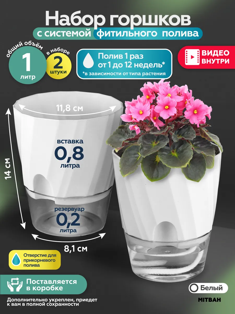Горшок с фитильным поливом кашпо для цветов 2 шт по 1 л. MITBAH