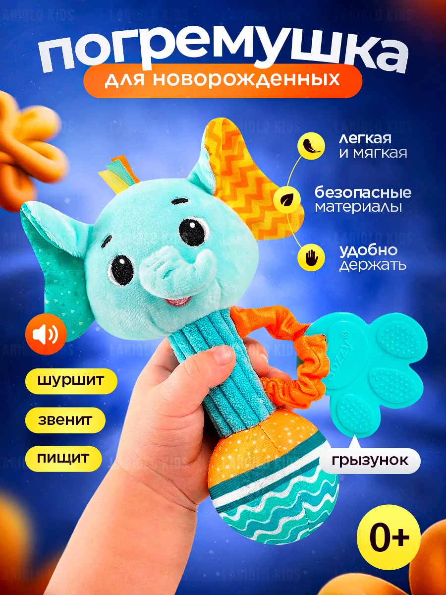 Игрушка пищалка шуршалка мягкая для новорожденных слон 0+. LARIQLO