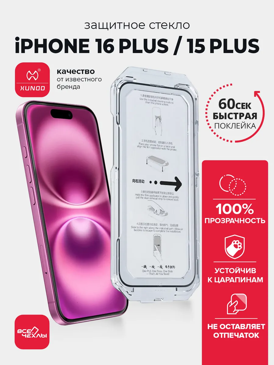 Защитное стекло для iPhone 15 Plus, 16+ с автоустановкой. ВСЕЧехлы
