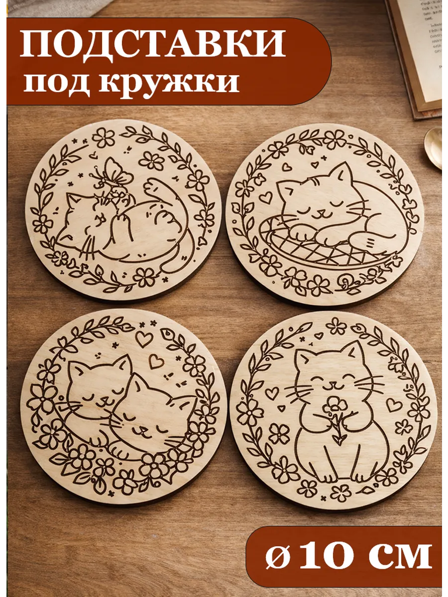 Подставка под кружку деревянная 4 шт, диаметр 10 см. ИП Беседин В.В.