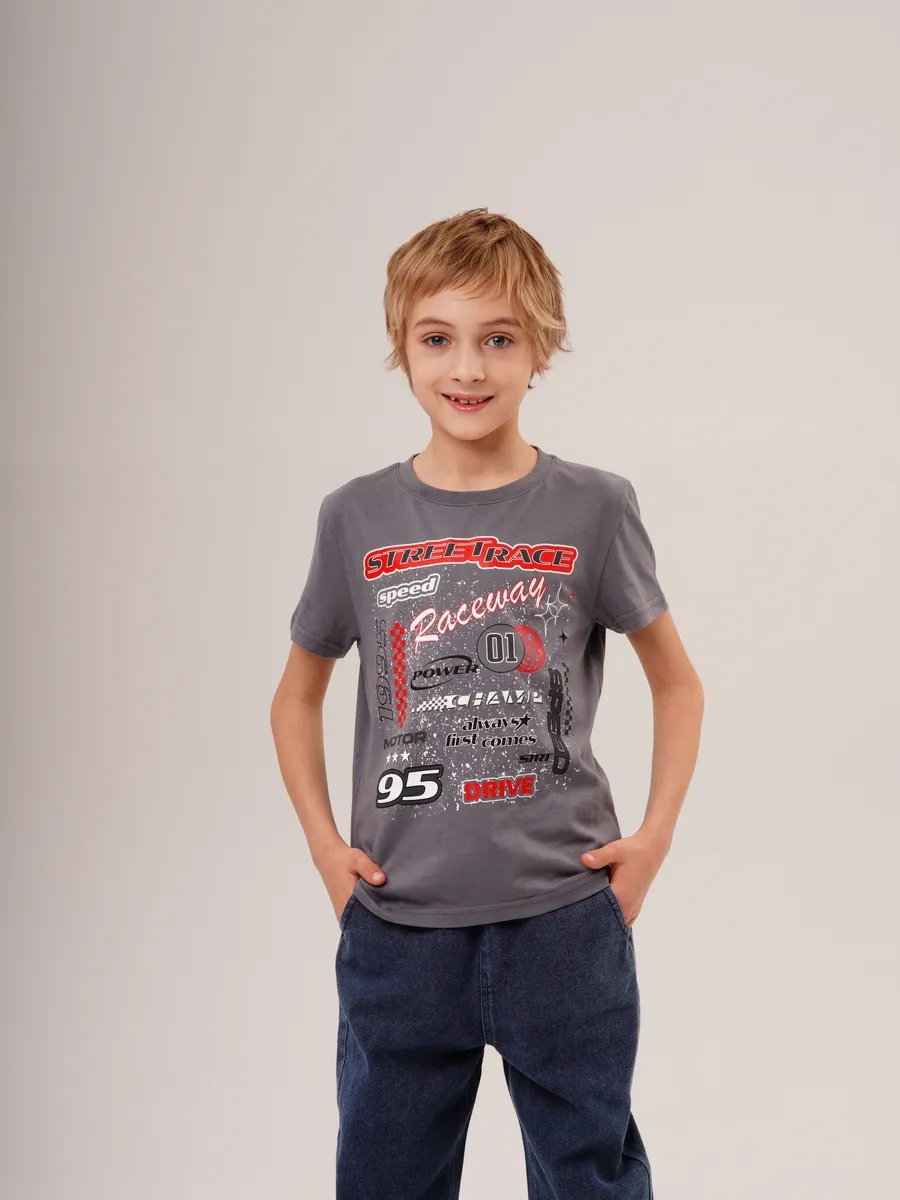Серая футболка с крутым принтом — идеальный выбор для мальчика! Этот комфортный и практичный предмет одежды станет отличным дополнением к его школьной форме или повседневной одежде. Принт сделан из высококачественной ткани и не會 деформироваться после стирки. Подойдет для мальчиков любого возраста.