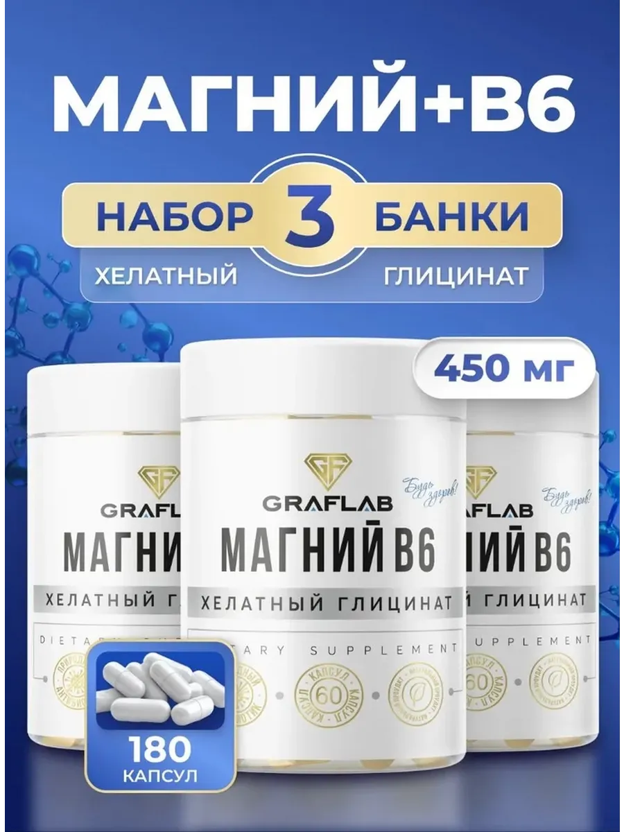 Улучшите свое здоровье с помощью Хелатного Глицината магния от GRAFLAB. Этот набор из 3 банок по 60 капсул содержит важные питательные вещества для поддержки мышечного и нервного здоровья. Вы можете использовать его для поддержки физической активности, снятия усталости и улучшения сна. Подойдет для занятых женщин, которые хотят поддерживать свой организм в тонусе.