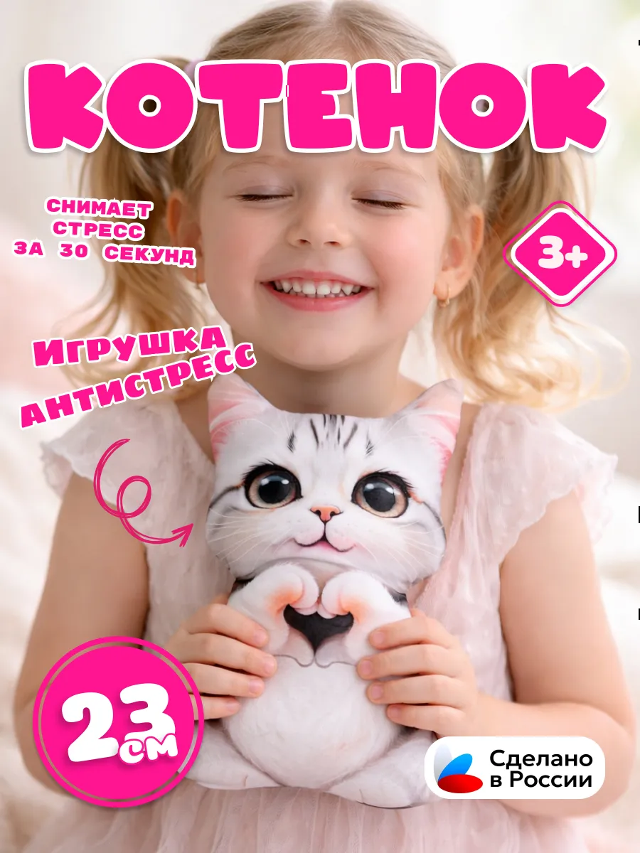 Мягкая игрушка Котенок станет прекрасным компаньоном для вашего ребенка, а также отличным помощником в снятии стресса и расслаблении. Игрушка выполнена из мягкого и безопасного материала, что делает ее идеальной для детей любого возраста. Размер: 23см.