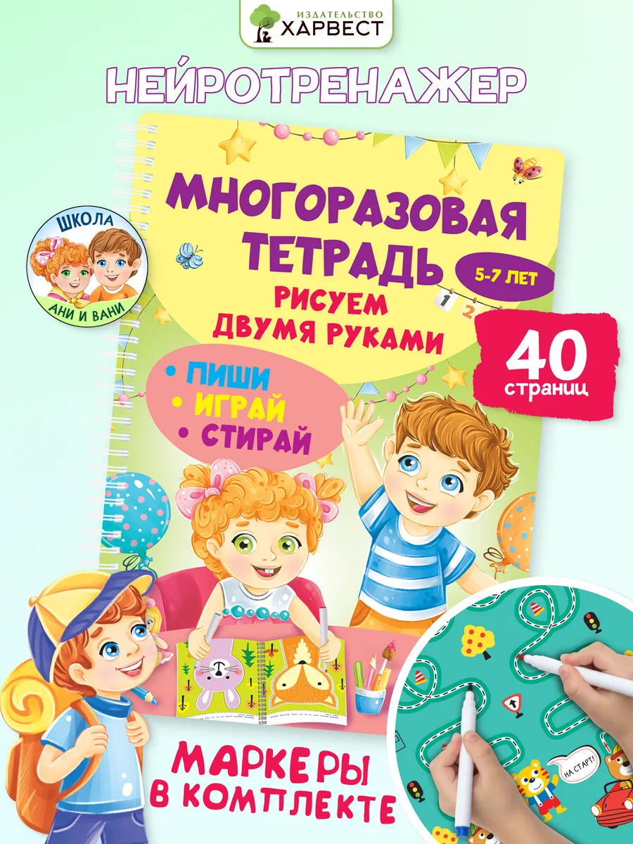 Многоразовая тетрадь Нейротренажер Рисуем двумя руками. Издательство Харвест