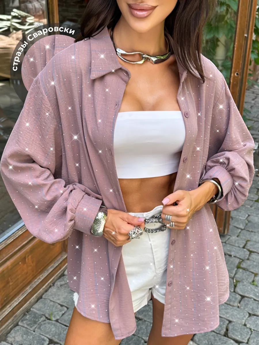 Оверсайз рубашка со стразами — идеальный выбор для женщин, которые ценят комфорт и элегантность. Этот нарядный топ можно носить на повседневной основе или на более формальных мероприятиях. Рубашка имеет удобную посадку, что делает ее идеальным выбором для женщин с формой. Стразы добавляют ей особый шик и красоту. Подойдет для женщин с различными типами фигуры, а также для тех, кто любит носить одежду с интересными деталями.