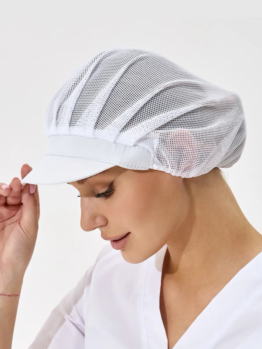Простая и практичная шапка повара с сеткой и козырьком. Облегчает приготовление пищи и поддерживает чистоту в вашей кухне. Шапка подойдет для женщин, занимающихся готовкой и любящих поддерживать порядок в доме.
