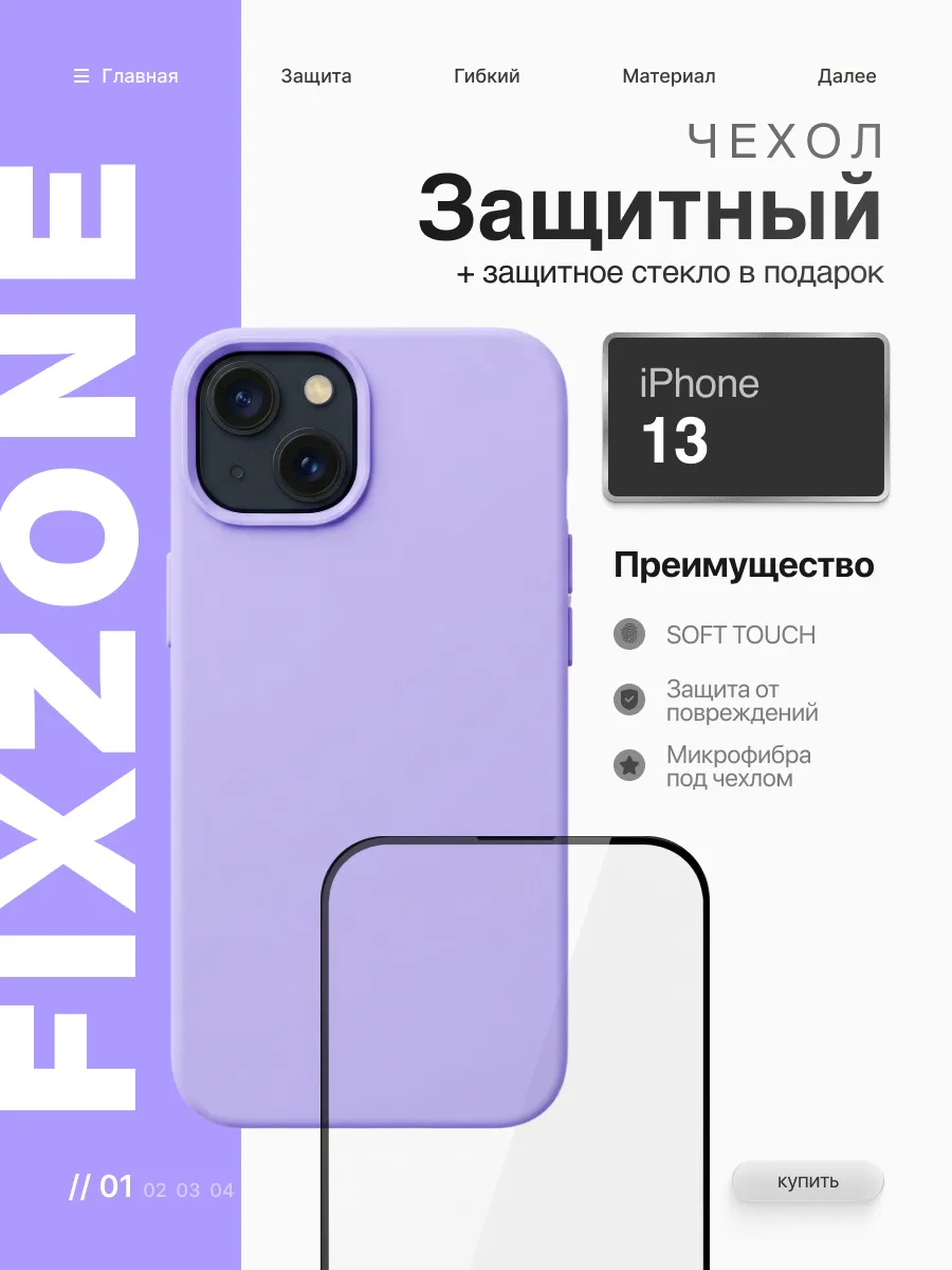 Чехол на iPhone 13 лавандовый силиконовый + защитное стекло. FixZone