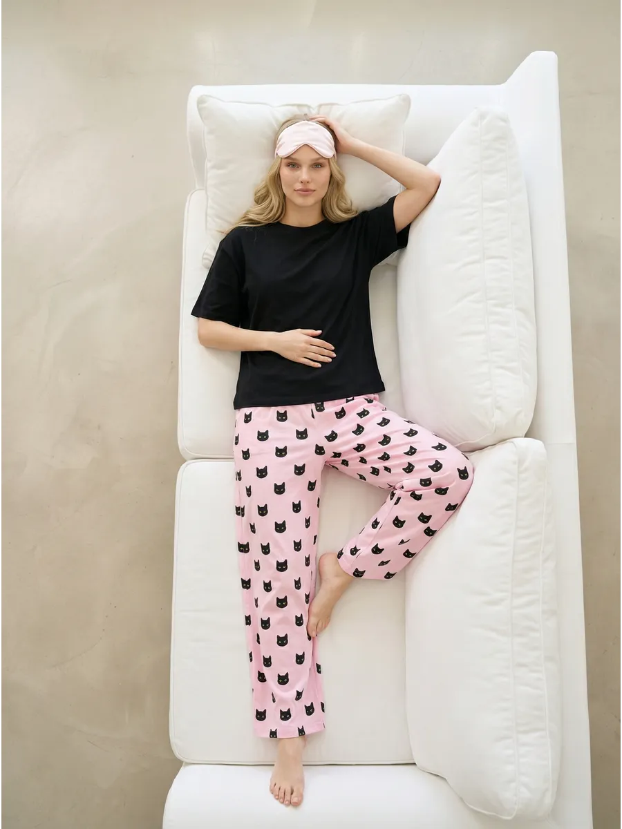 Пижама с принтом кошек и брюками станет идеальным выбором для женщин, любящих животных. Этот комфортный комплект из пижамы и брюк сделает ваш день лучше. Пижама из мягкого и натурального материала, а брюки из эластичного джерси. Принт кошек добавит вам уюта и радости. Идеально подходит для домашней носки или для отдыха на выходных.