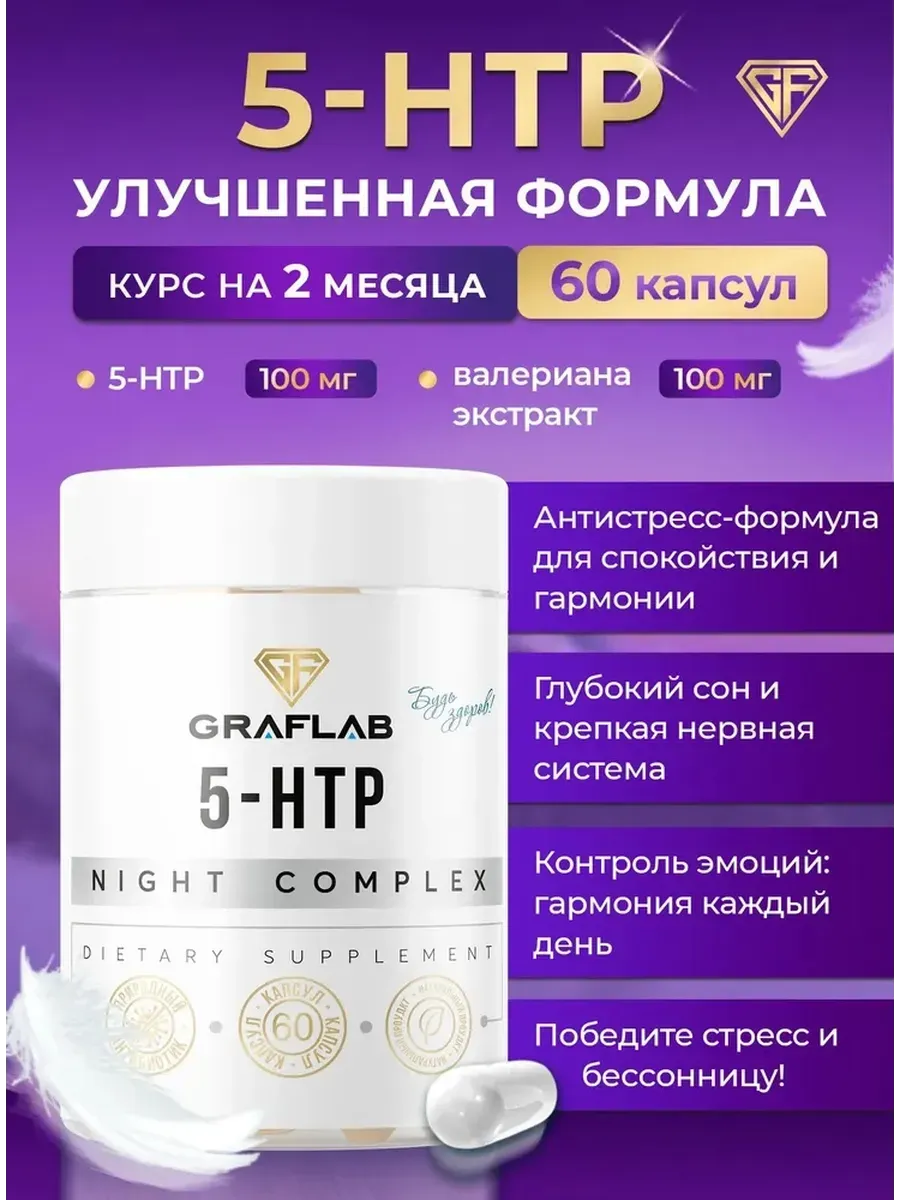 Улучшайте свой сон и настроение с натуральными ингредиентами. Этот комплекс из 5-HTP и экстракта валерианы поможет снизить стресс и улучшить качество сна. Подойдет для тех, кто ищет естественные средства для улучшения самочувствия и снотворного эффекта.